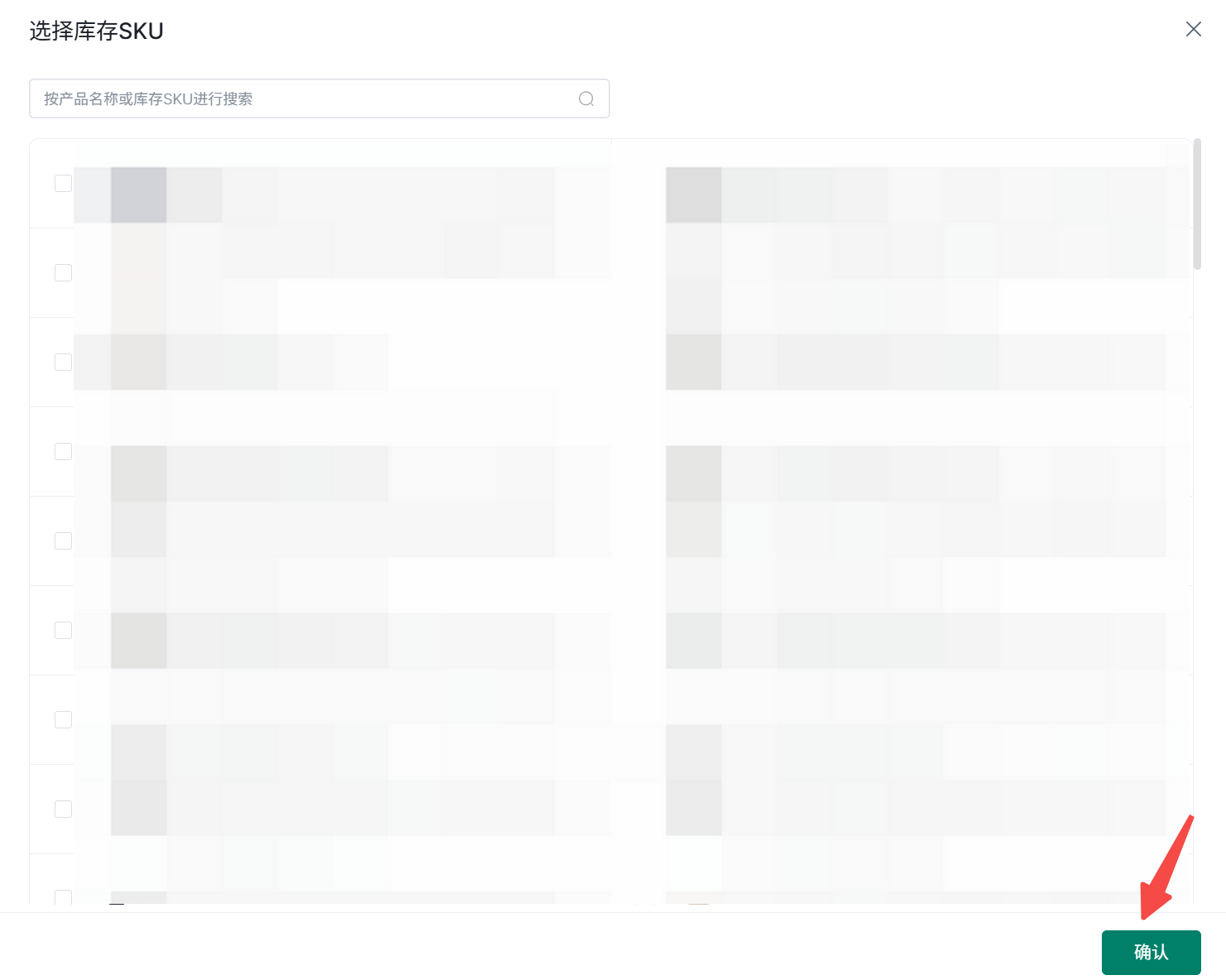 3、 按商品名称或SKU搜索选择SKU>选择要添加的商品>确认