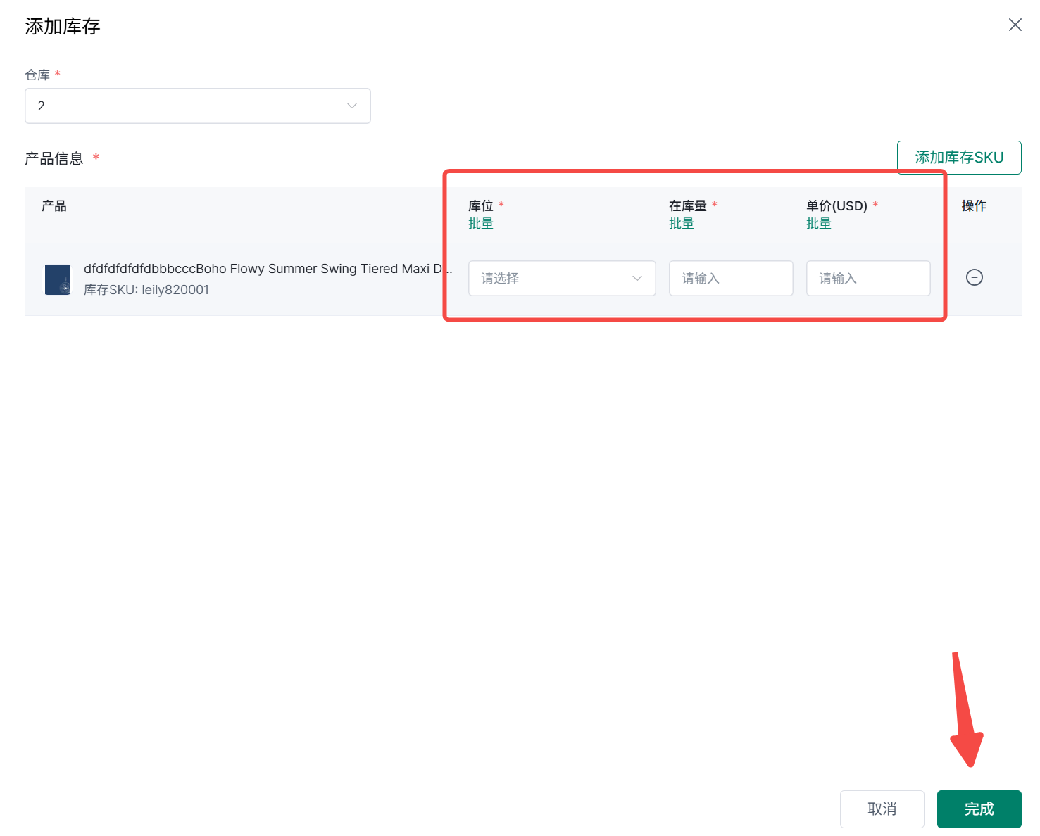 4、下拉选择库位> 填写在库量”和单价> 完成