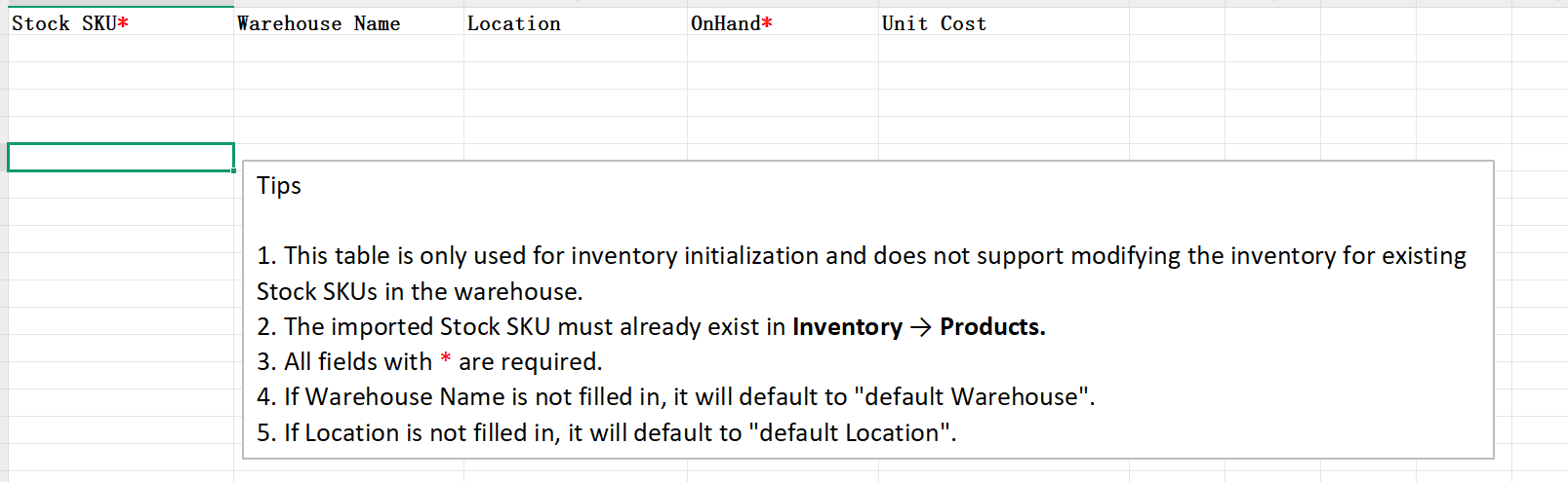 3、 将SKU、仓库名称、位置、在库量和单价填写到表格中