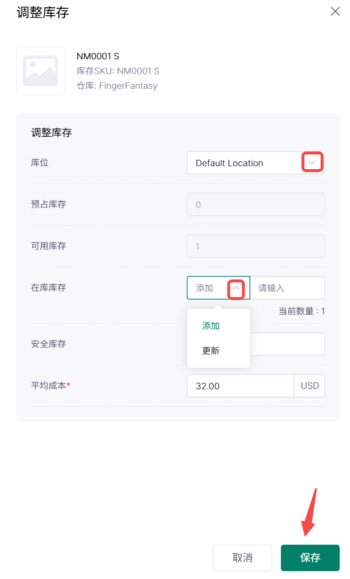 3、可以更改相关信息,在库库存可以选择添加或更新,点击保存。