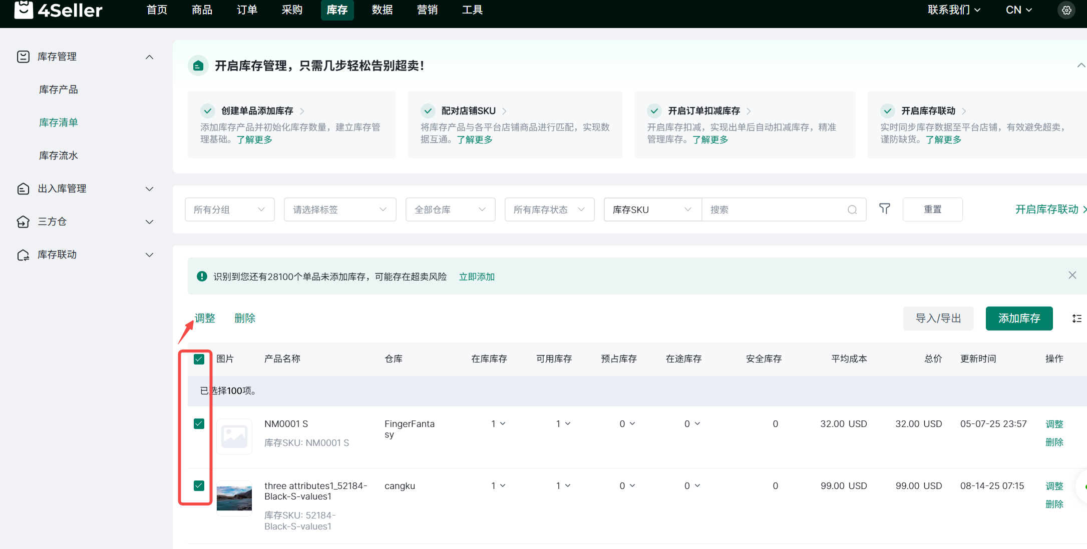 1、勾选多个SKU>调整。