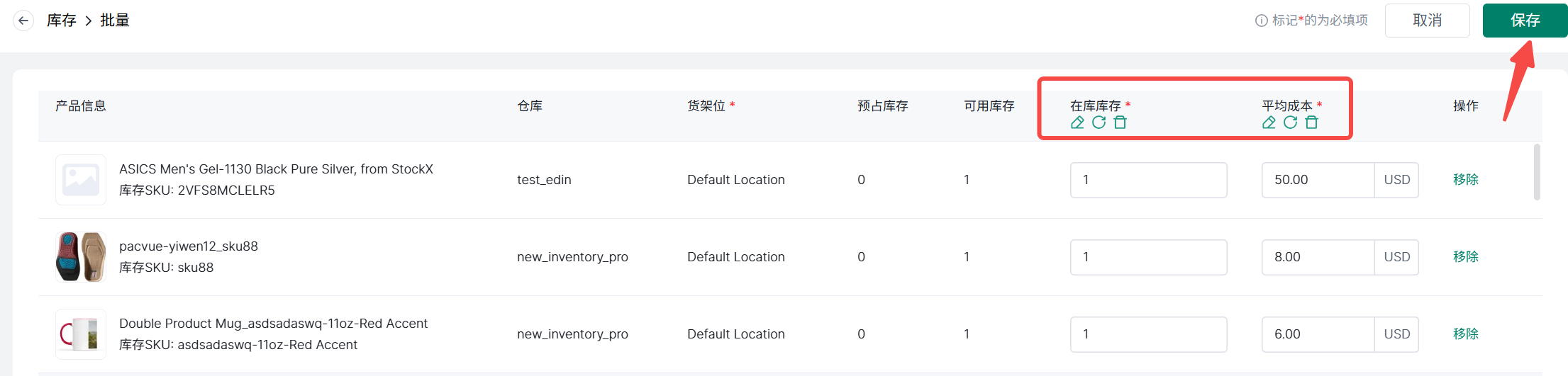 2、批量编辑列表中的在库库存、平均成本等,点击保存。