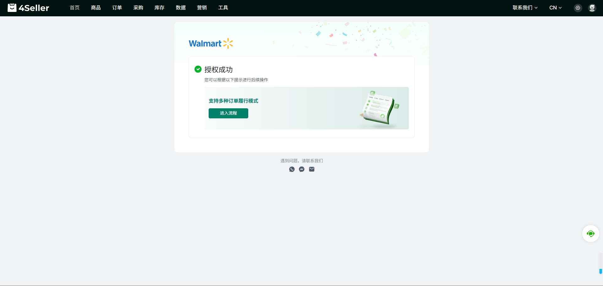 进入4Seller的 设置 > 店铺管理 页面,点击 Walmart图标 开始授权。