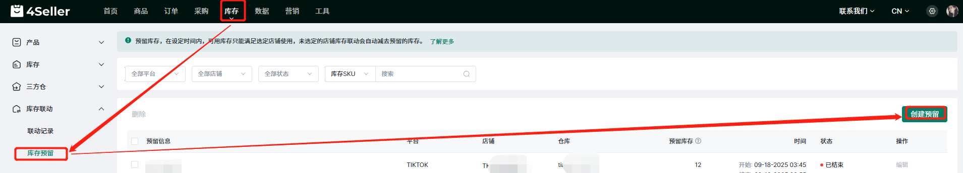4Seller支持库存预留,意在协助用户将部分库存预留给特定渠道,如:TikTok申报平台活动等,保证库存充足。