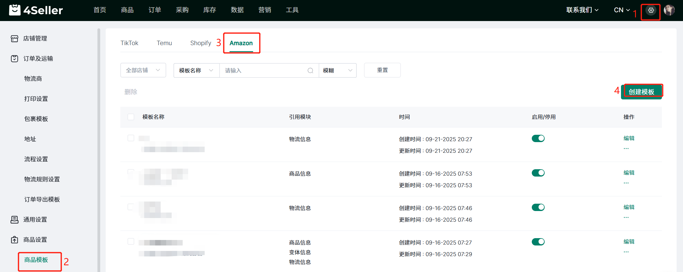 步骤一:设置--商品设置--商品模板--选择Amazon平台--创建模板