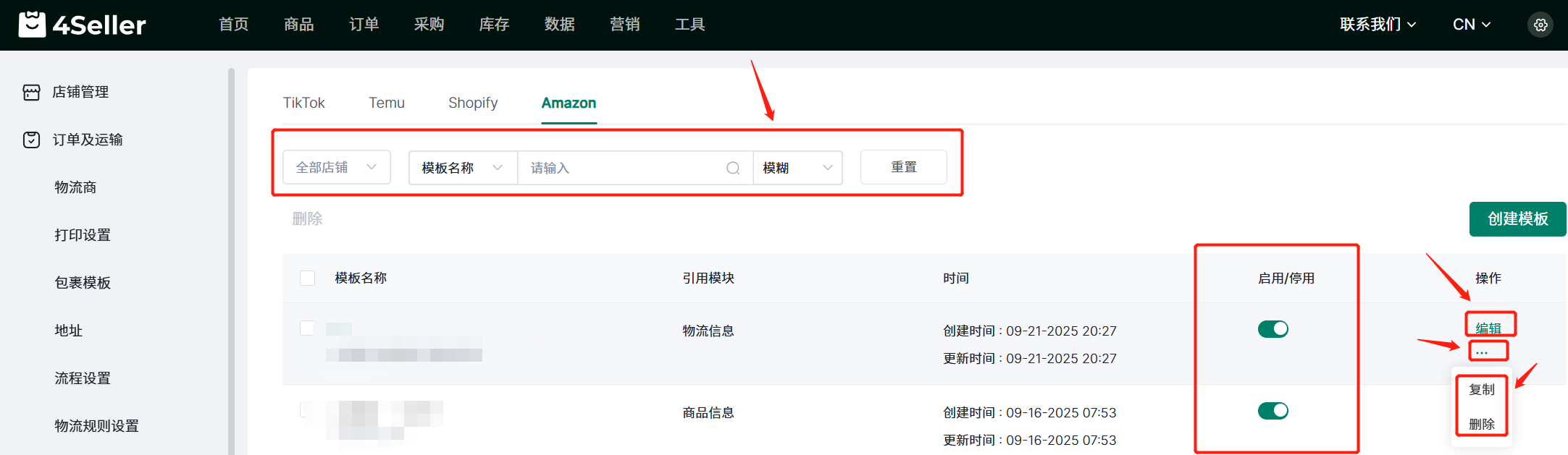 完成模板设置后,可在商品模板界面查看已设置的模板,可按照店铺名称、模板名称进行搜索;查看模板状态是否启用/停用,同时支持再次编辑更新模板,或是复制、删除模板。