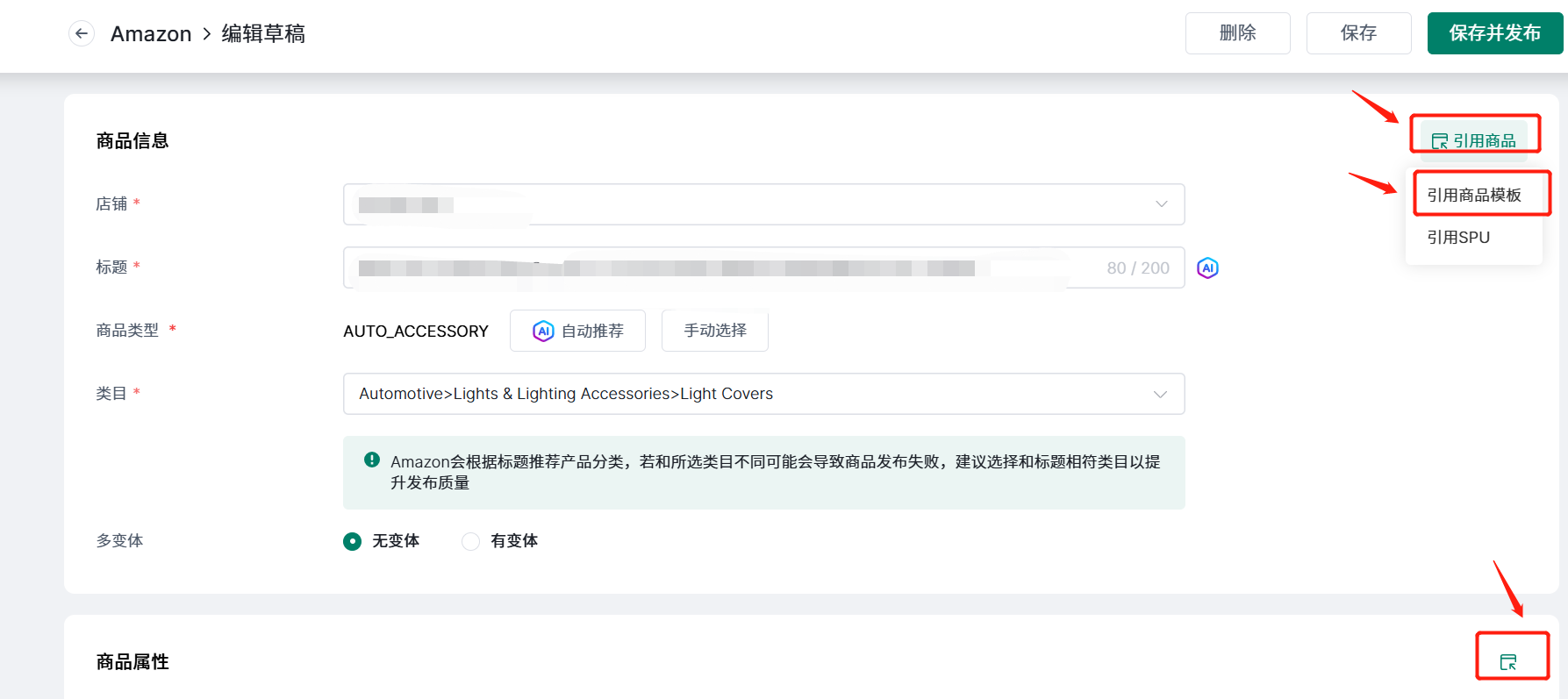 步骤二: 商品--Amazon草稿--创建/编辑商品--引用商品模板