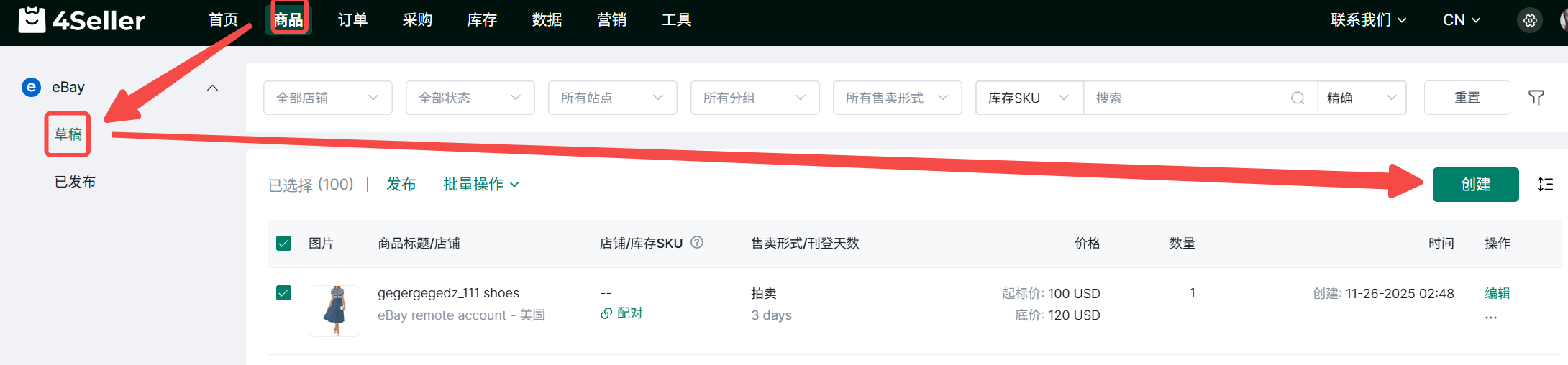 步骤一:商品--eBay--草稿--创建