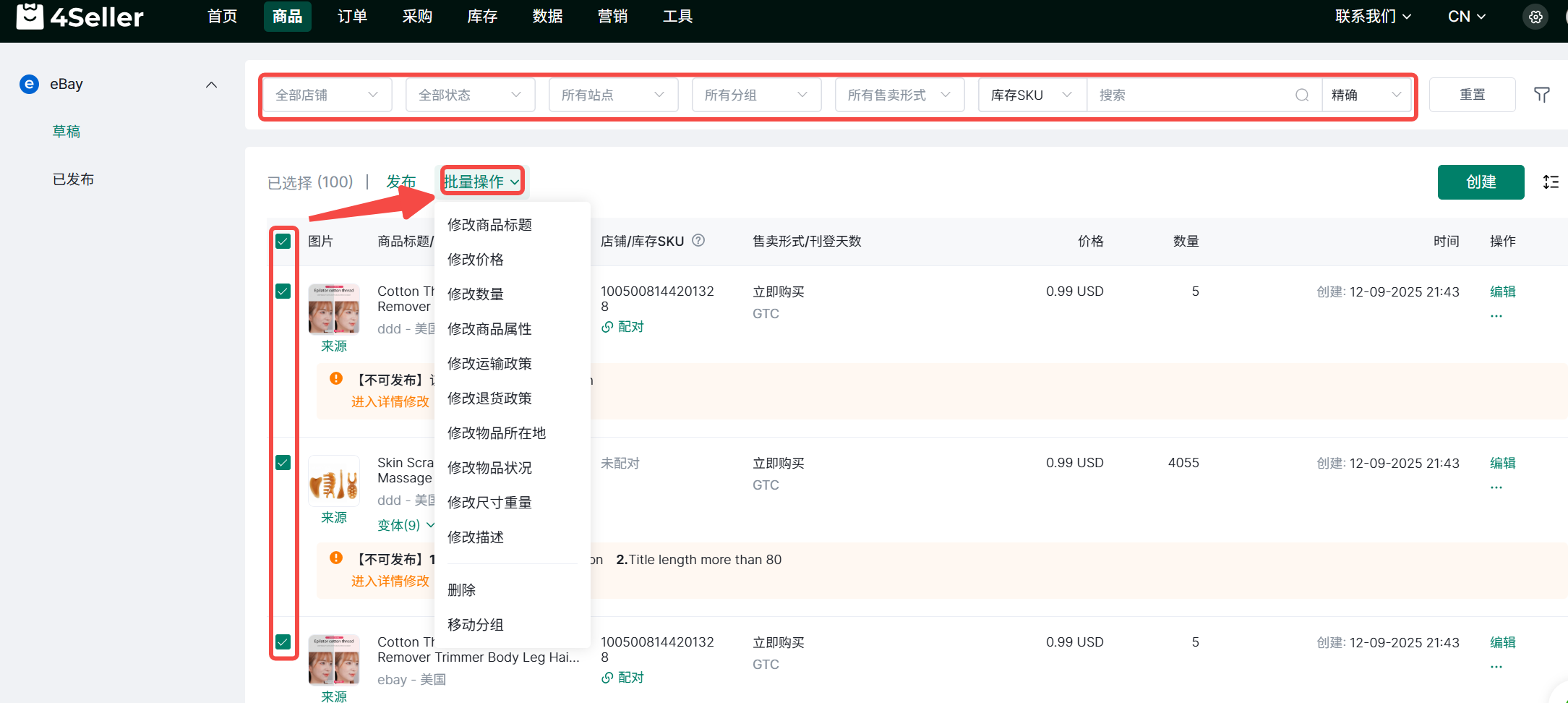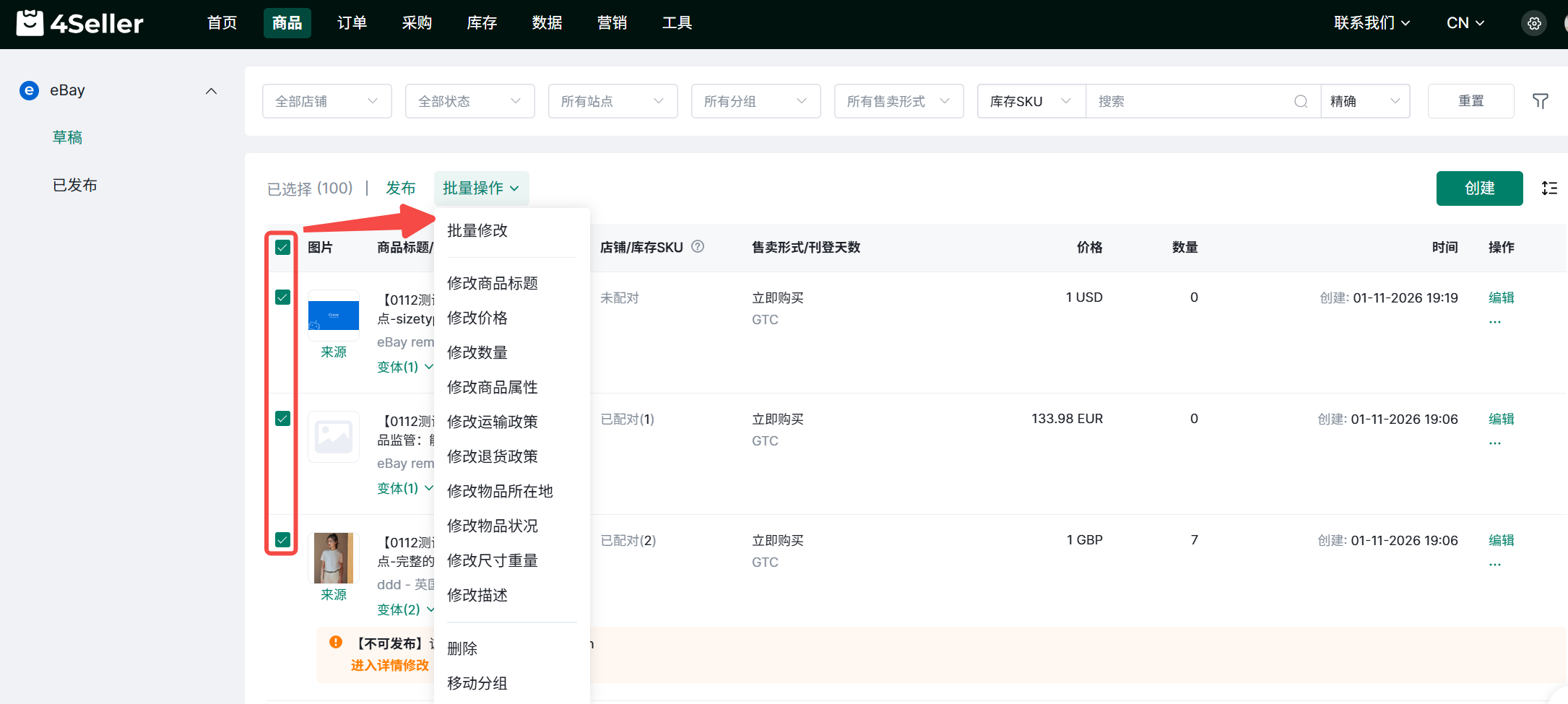 (1)在草稿或者已发布页面,筛选需要批量操作的商品,勾选后点击批量操作,分别选择需要修改的属性进行批量修改。