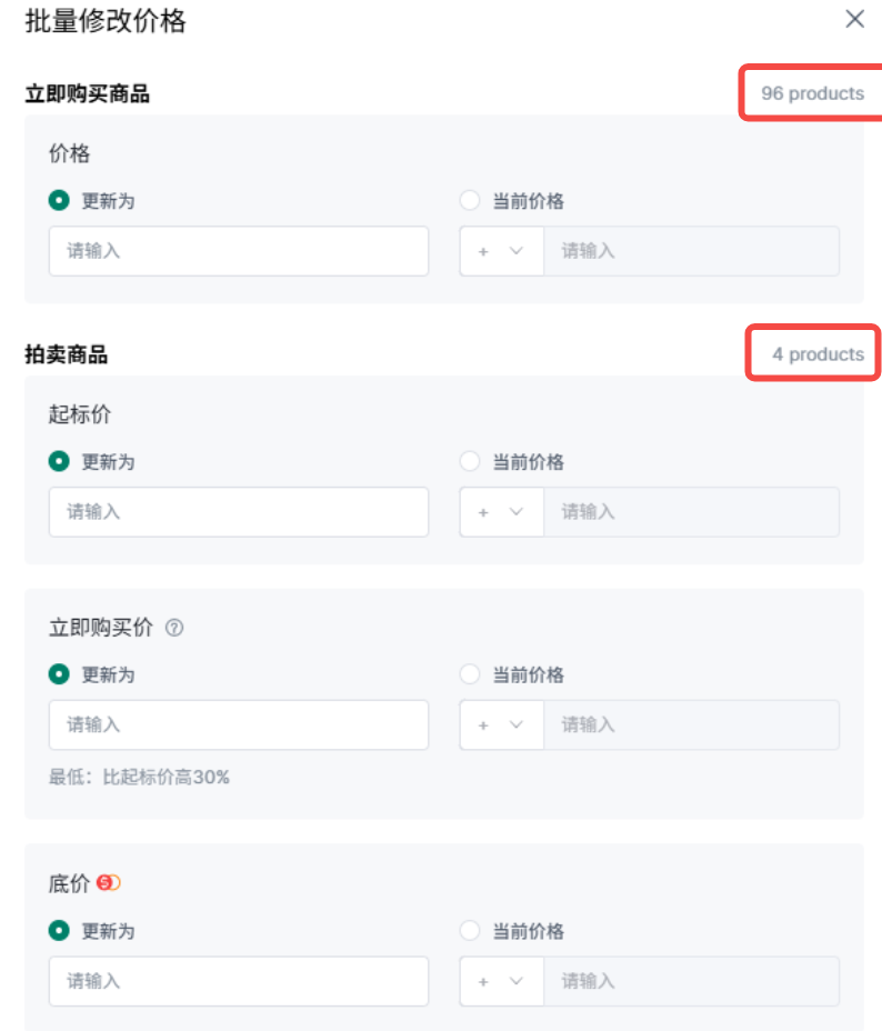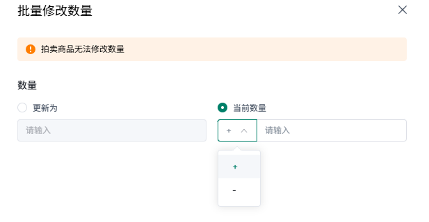 ①仅支持修改售卖类型为“立即购买"的商品数量,拍卖商品无法修改数量;