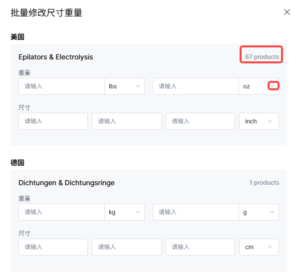 (10)批量修改尺寸重量: