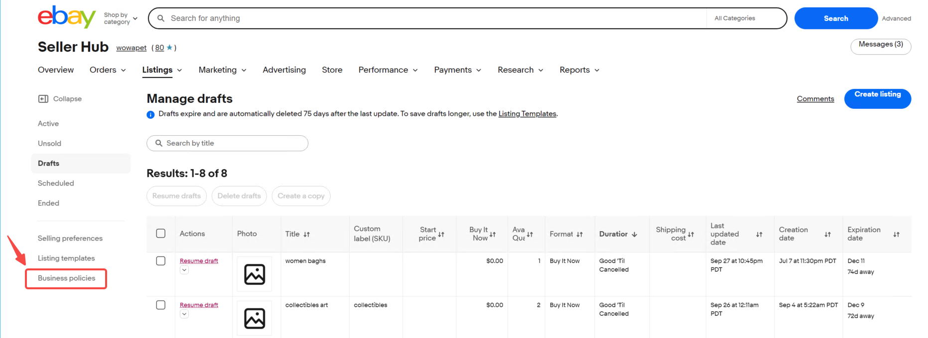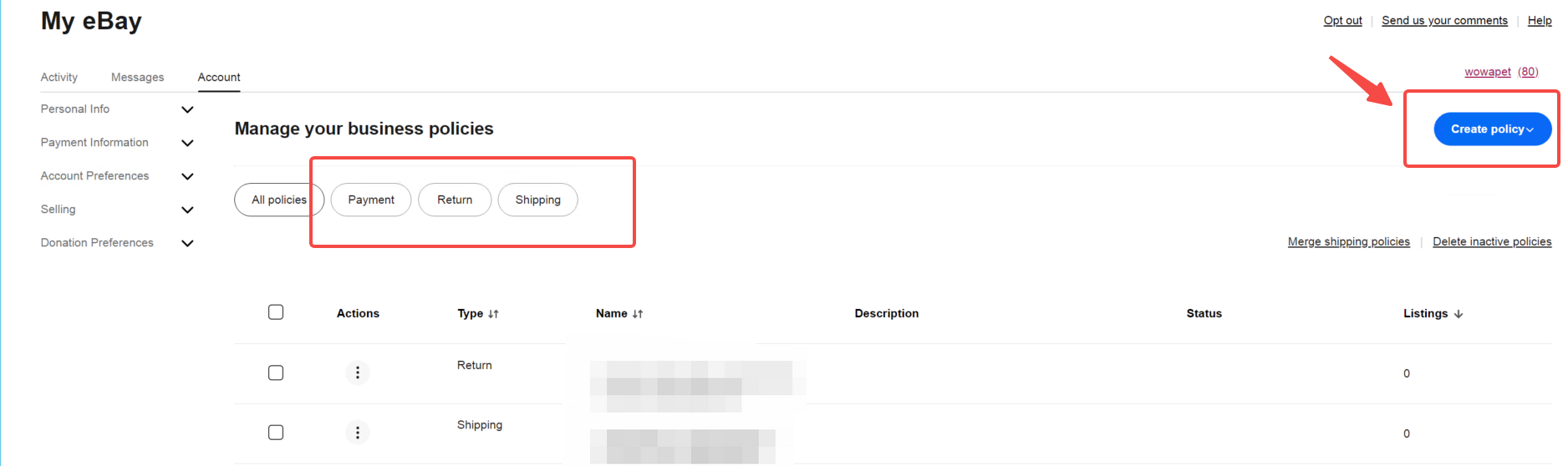进入eBay后台,按照如下指引可选择不同类型政策信息进行设置添加,添加后将同步至4Seller。