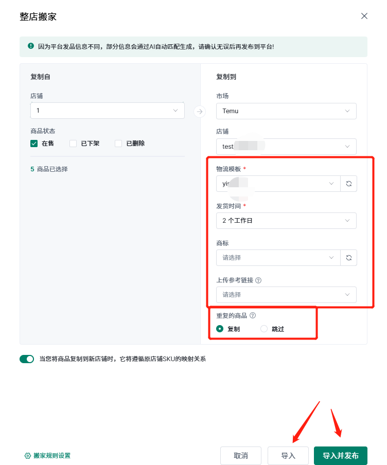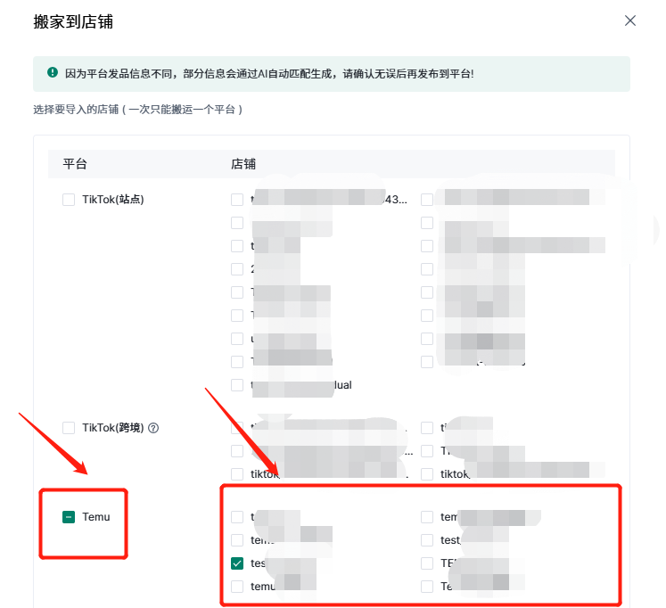 1.勾选要导入的目标平台(TEMU)和店铺;