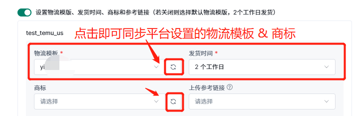 2. 选择设置物流模板、发货时间、商标和参考链接(若关闭则默认物流模板及选择2个工作日为发货时间)