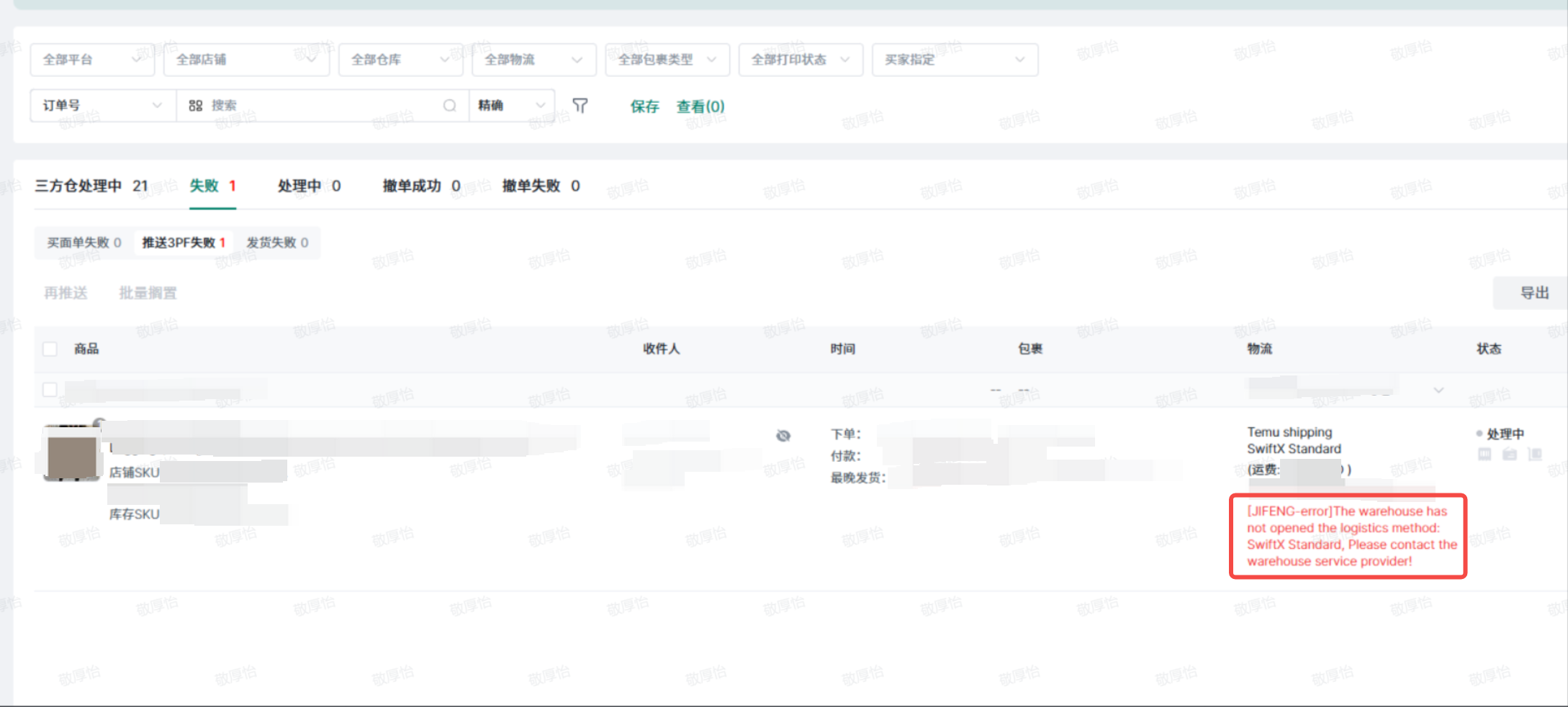 [3PF-errorl The warehouse has not opened the logistics method: XXX XXX, Please contact the warehouse service provider!