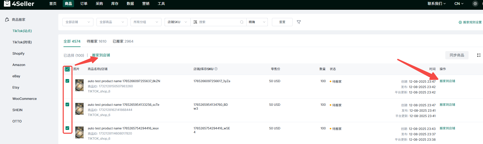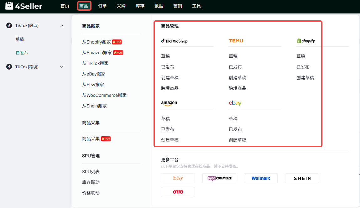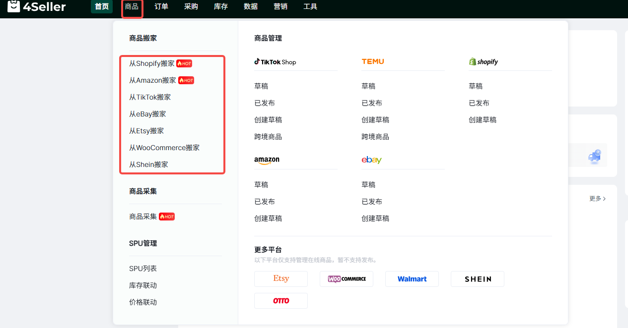 4Seller支持把Shopify 、Amazon、TikTok、eBay、Etsy、WooCommerce、Shein的商品搬家到Temu进行刊登,此处搬家含义为复制粘贴,搬家后原店铺数据不会删除;