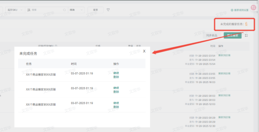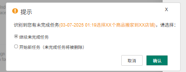 (1)一个店铺仅支持同时进行一个搬家任务,若存在之前未完成的搬家任务,会出现弹窗提示,可以选择继续完成或者开始新任务(未完成任务将删除),选择后确认。