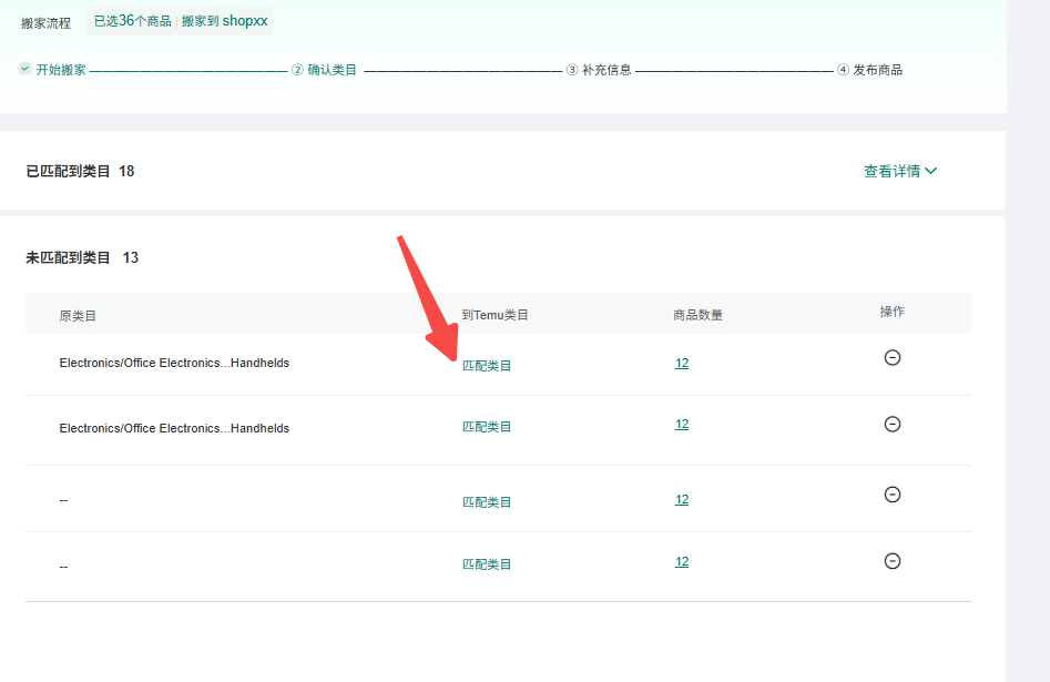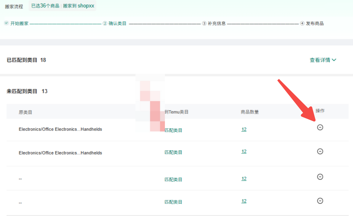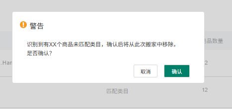 2、点击下一步,若存在未匹配类目的商品,确认后此次搬家会移除