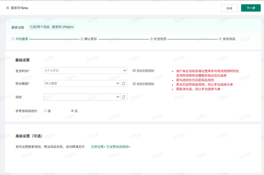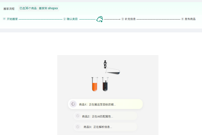 搬家流程一共分为4步:开始搬家-确认类目-补充信息-发布商品,此步骤仅帮助用户提高刊登效率,完成以上流程后直接发布到平台。一、搬家入口