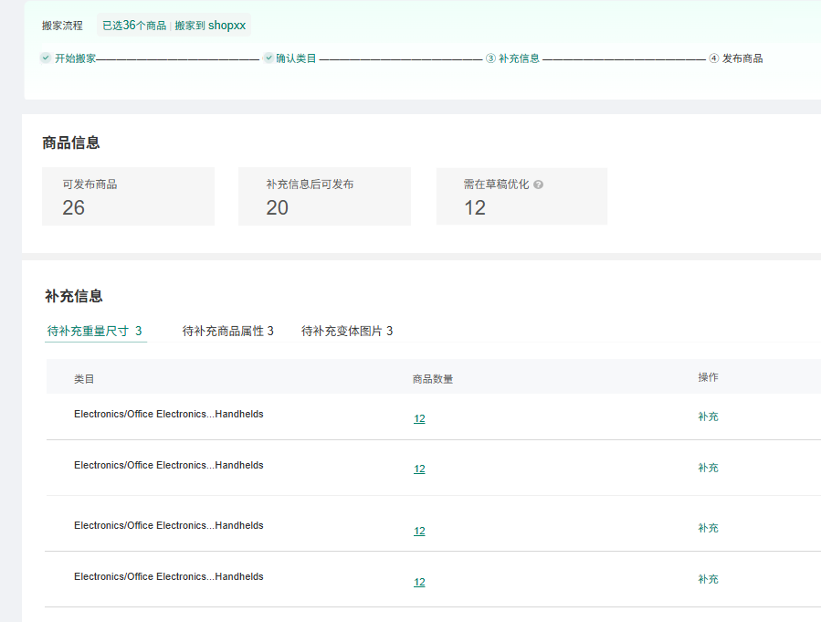 由于不同平台之间的信息要求不同,需要对搬家后的商品信息进行补充修改方能成功发布。四、补充信息