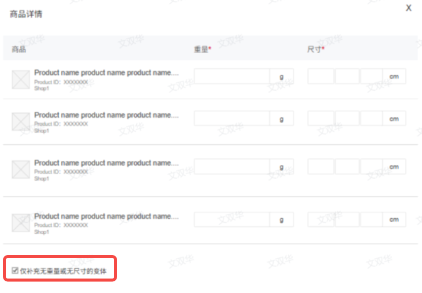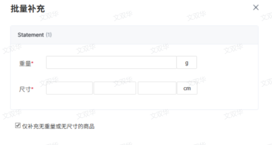 (1)待补充重量信息尺寸,可勾选仅补充无重量无尺寸的变体