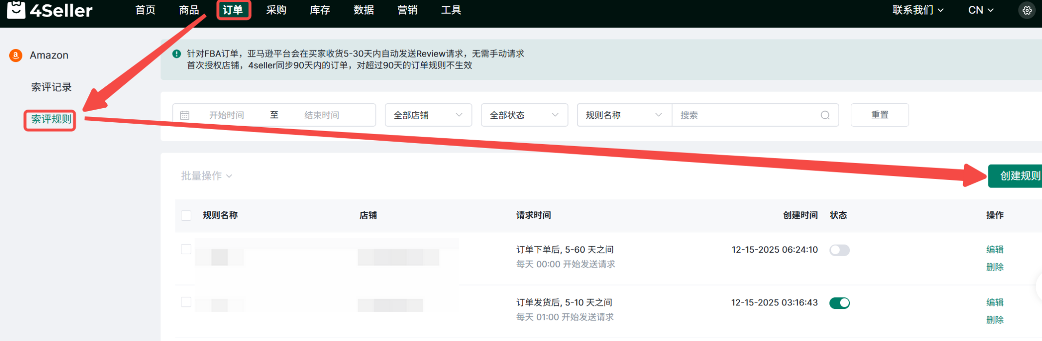 (1)点击订单-索评规则-创建规则