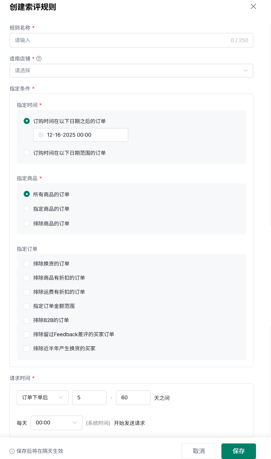 (2)填写规则名称,选择适用店铺(一个店铺只能存在于一个规则中),选择指定条件和请求时间,保存后在隔天生效