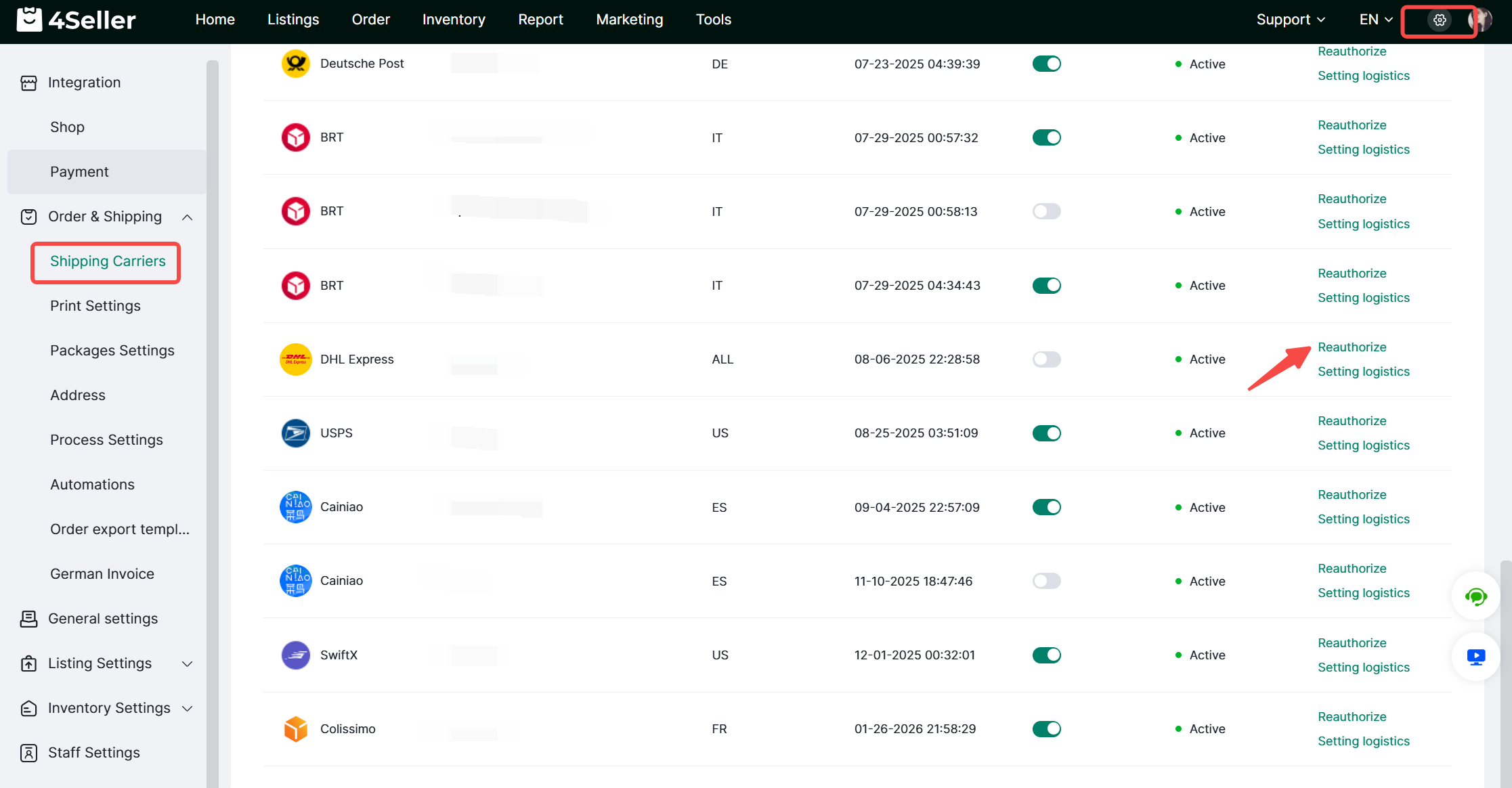 使用DHL来购买面单时,出现此报错:The system of the shipping carrier is abnormal, and the application tracking number failed, Please tr... (如图) 请检查DHL的账户是否为封禁状态。是的话,请联系DHL有关工作人员修改账号和密码。 成功后,在4seller中重新授权此账户。