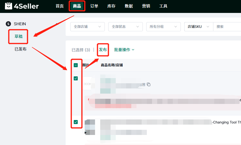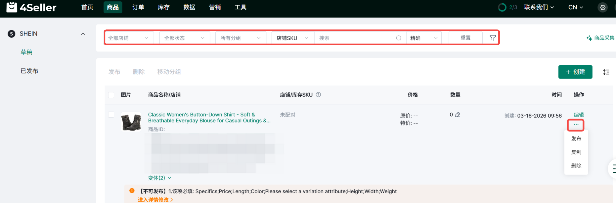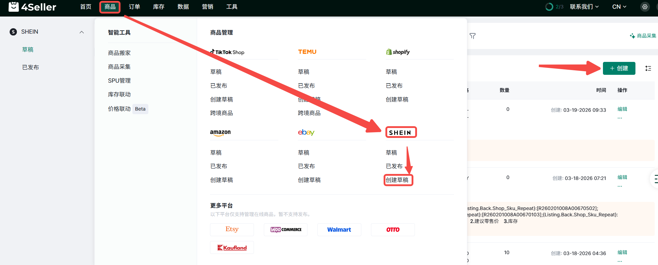 1、点击商品-SHEIN-草稿-创建草稿,或者进入商品页面以后点击创建。