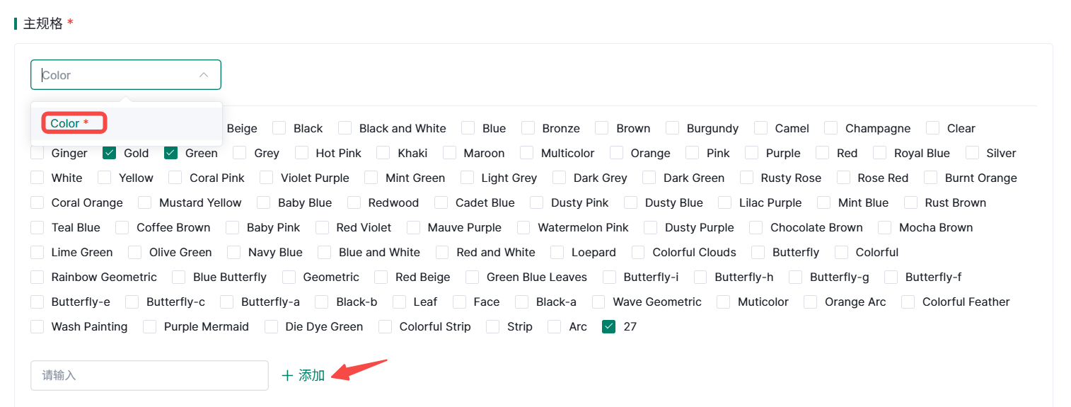 ①主规格,为必填项,标红的为必选属性,可以点击添加自定义添加属性。