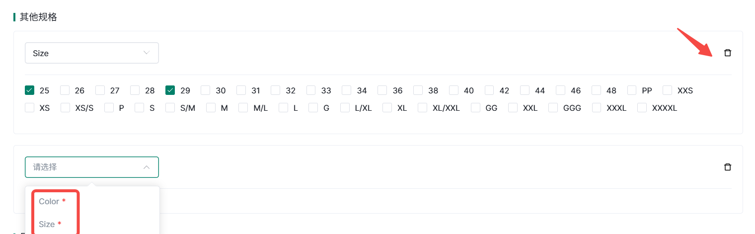 ②其他规格,标红项为必选属性,支持自行添加规则属性和删除。