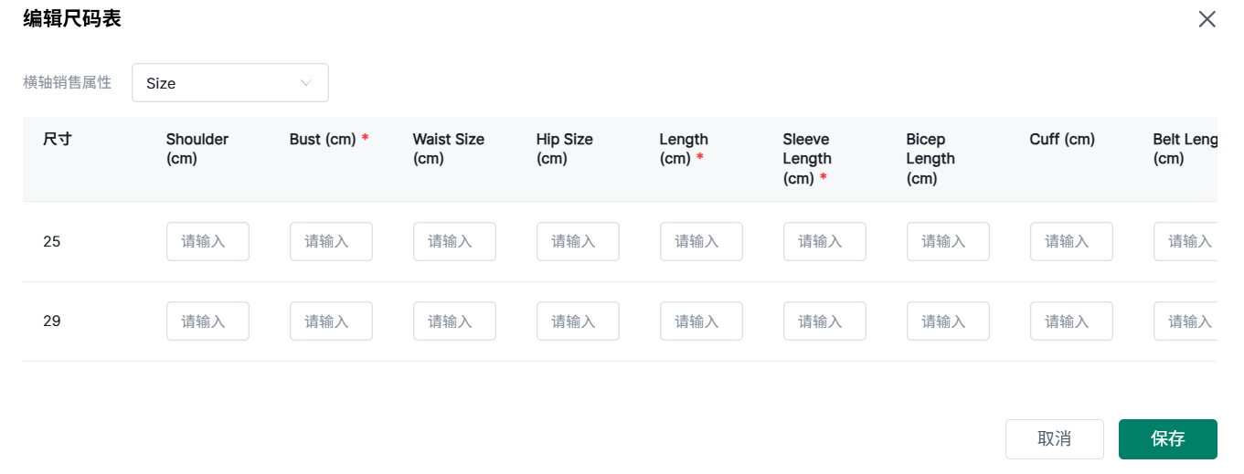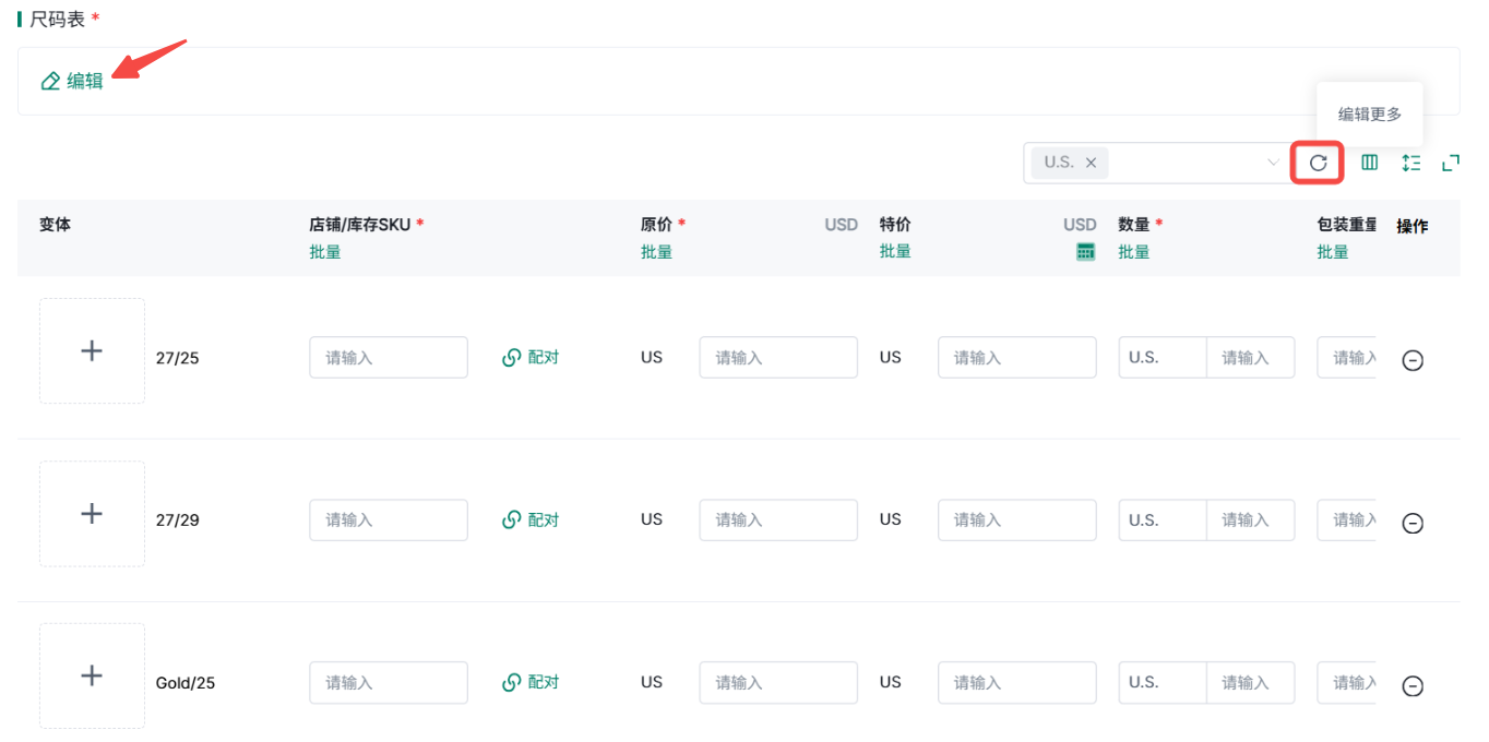 ③尺码表,点击编辑按钮填写尺码信息。