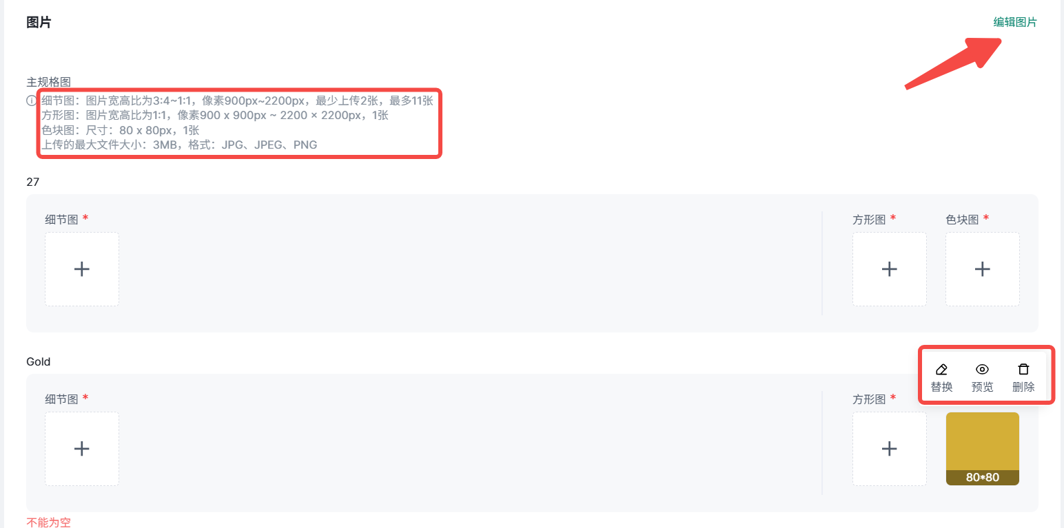 ⑤图片,标红的为必须上传的图片,若主规格属性数量≥2,则需填写色块图,不同图片需要按照相关要求填写,点击编辑图片支持批量调整图片尺寸。