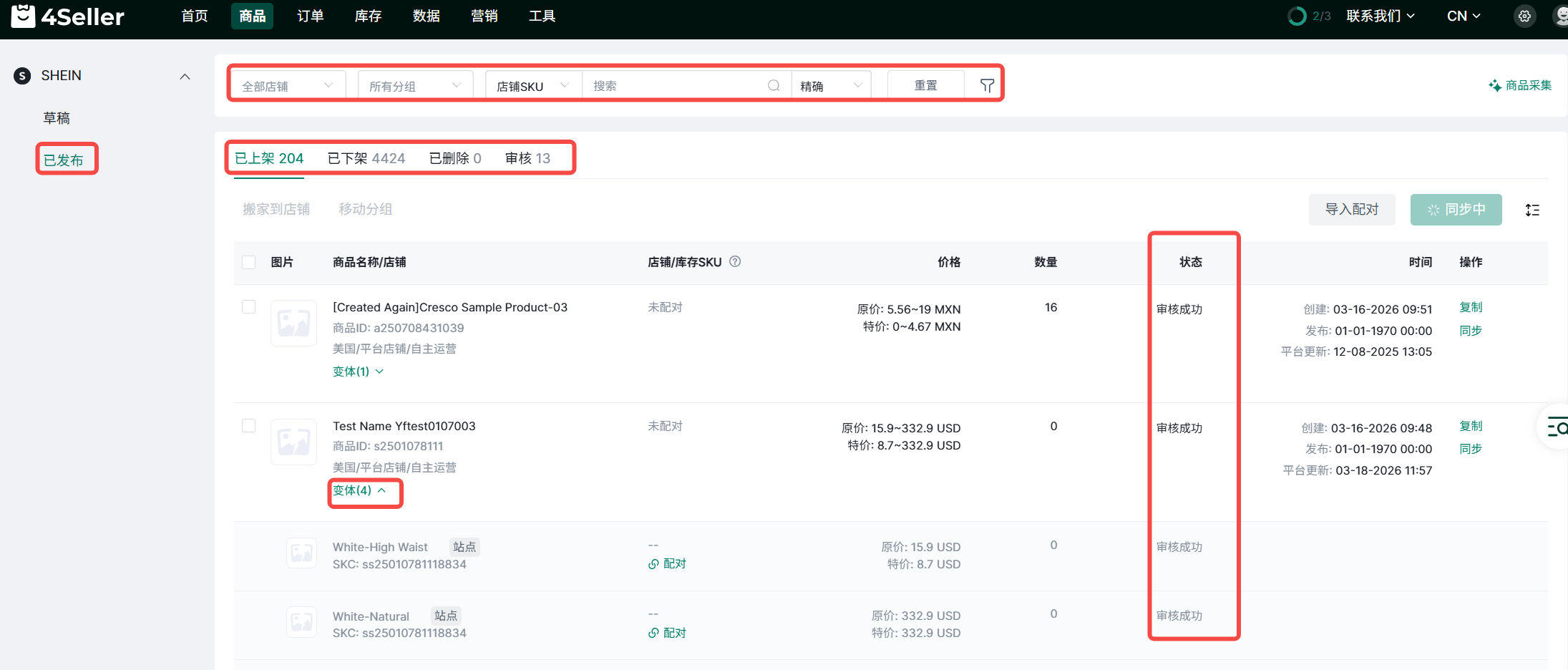 (2)发布成功后会显示在已发布列表,点击变体展开可查看各个变体的发布状态。点击复制可复制商品信息到草稿状态,同步可将平台的信息更新到列表页。
