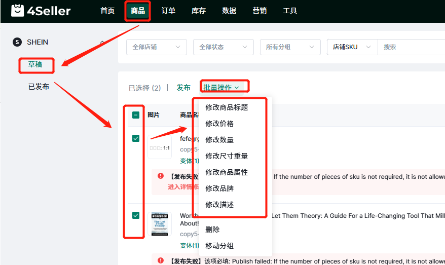 1、商品--草稿--批量选择listing--选择需批量编辑的信息