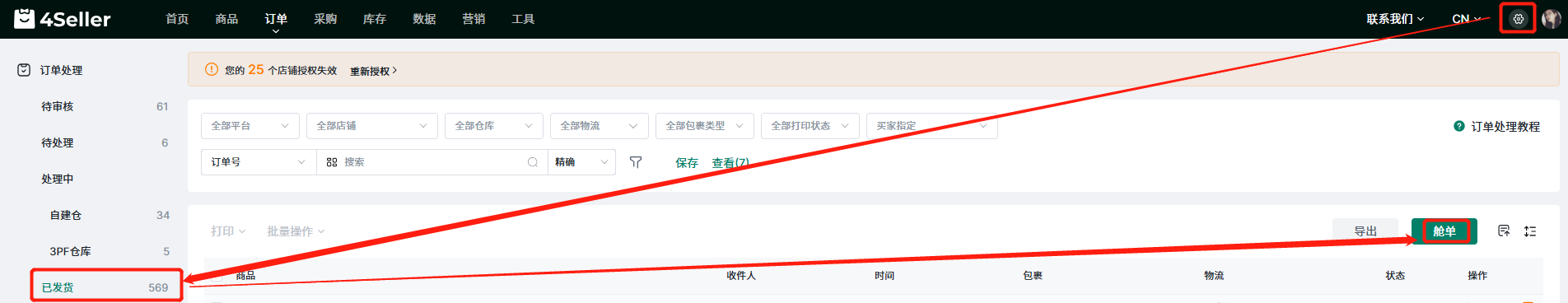 授权物流商请参考帮文:如何授权物流商至4Seller?步骤二:订单--已发货--舱单--创建舱单
