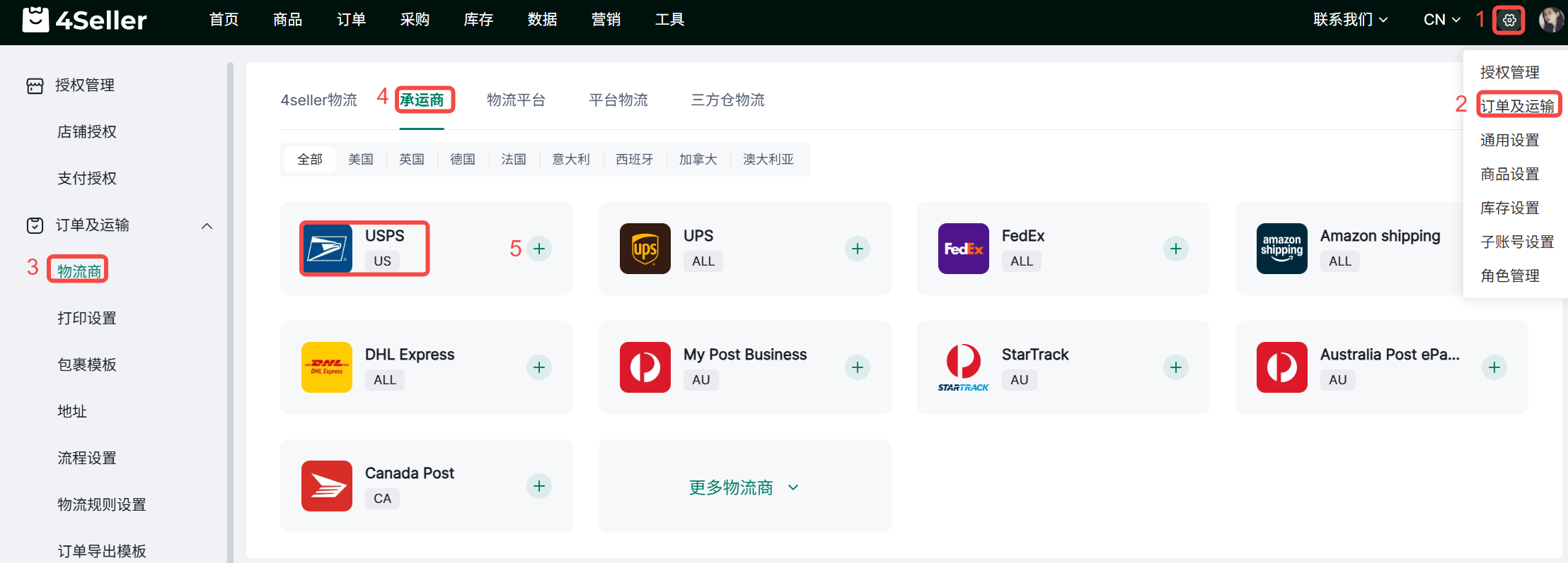 1、点击设置-订单及运输-物流商-直营物流商-找到USPS NEW 点击“+”